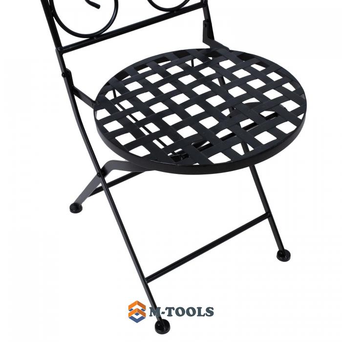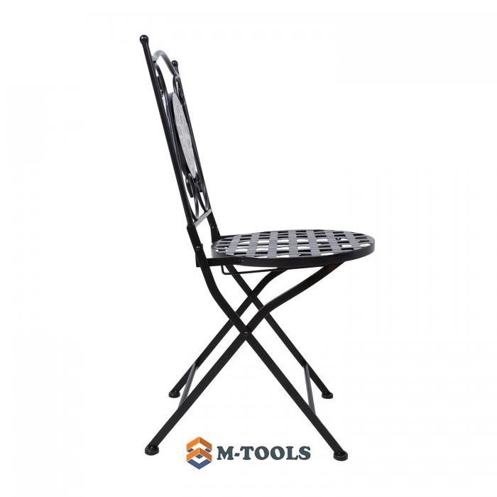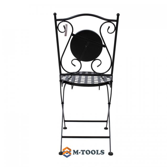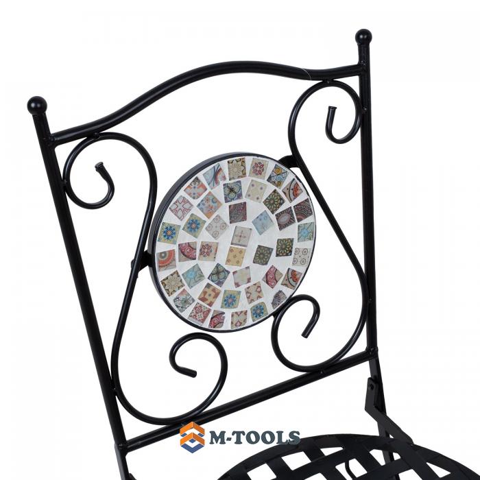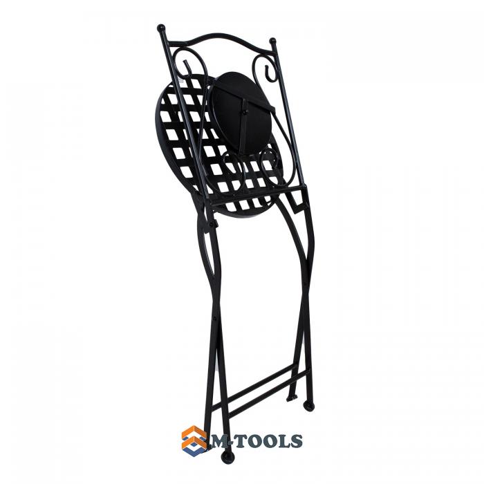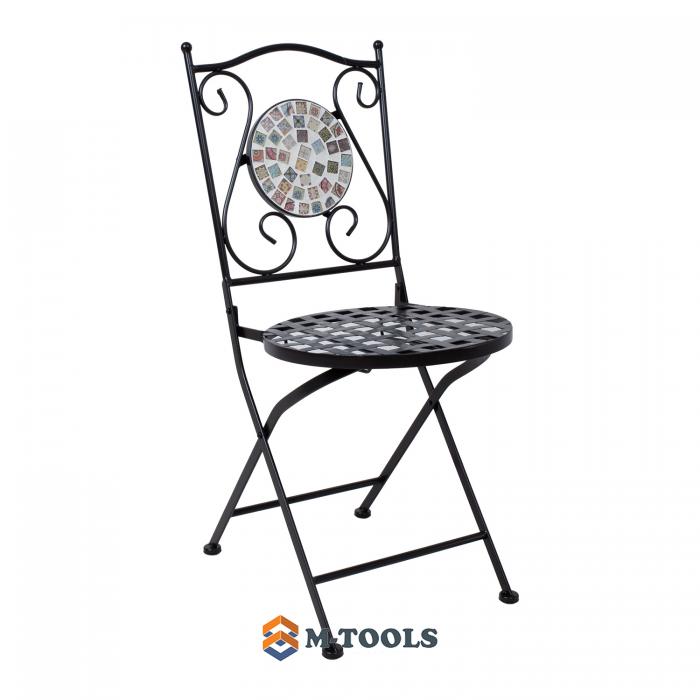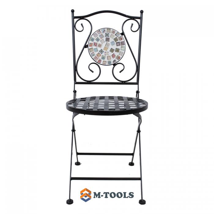 Foldable chair CHECKER. The chair is made of metal and finished with a black powder coating. The backrest is decorated with a mosaic tile in brown and gray tones. The chair is foldable. The overall dimensions of the chair are 38x51xH88cm. The diameter of the round seat is 38cm. The height of the seat is 47cm. Weight limit 90 kg. The dimensions of the chair when folded are 38x99x17cm.. STORAGE: at the end of the summer season, we recommend storing the garden furniture indoors. Clean and dry the furniture before storing it. Use a cool, dry, and well-ventilated room for storage. |