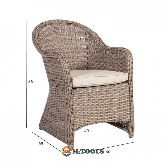 Chair TOSCANA 60x69xH86cm, beige. The powder-coated aluminum frame of the chair is covered with plastic wicker. Seat cushion included. The cushion cover is made of beige polyester fabric. Cushion thickness 5cm. Weight limit 100kg. The product is durable in changing weather conditions and easy to maintain. Only the cushion needs protection from the weather. STORAGE: at the end of the summer season, we recommend storing the garden furniture indoors. Clean and dry the furniture before storing it. Use a dry, well-ventilated room for storage. |