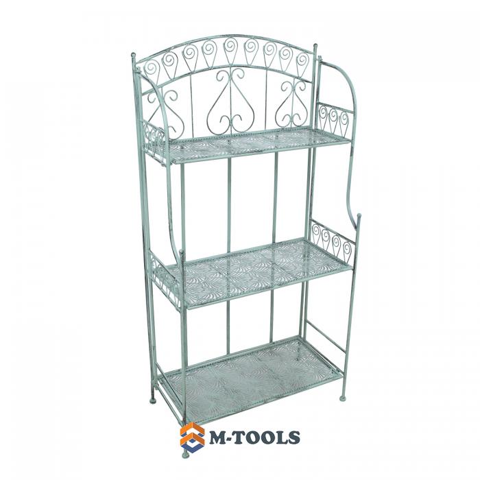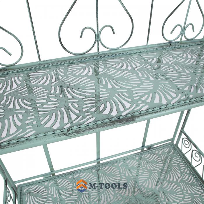 Shelf MINT 59x31xH117cm, antique green. Wrought metal garden furniture is stylish and durable! In the finishing process, the powder coating combined with an electrophoretic coating provides excellent rust resistance. The dimensions of the upper shelf are 55x21cm, the dimensions of the lower shelves are 55x27cm, the distance between the shelves is 38cm.The product is suitable for both indoor and outdoor use. |
