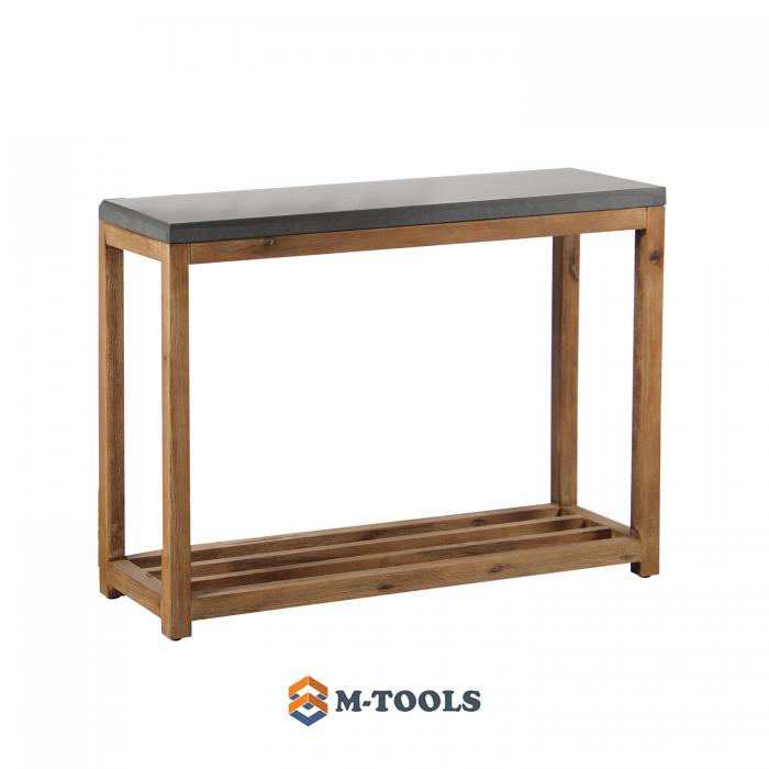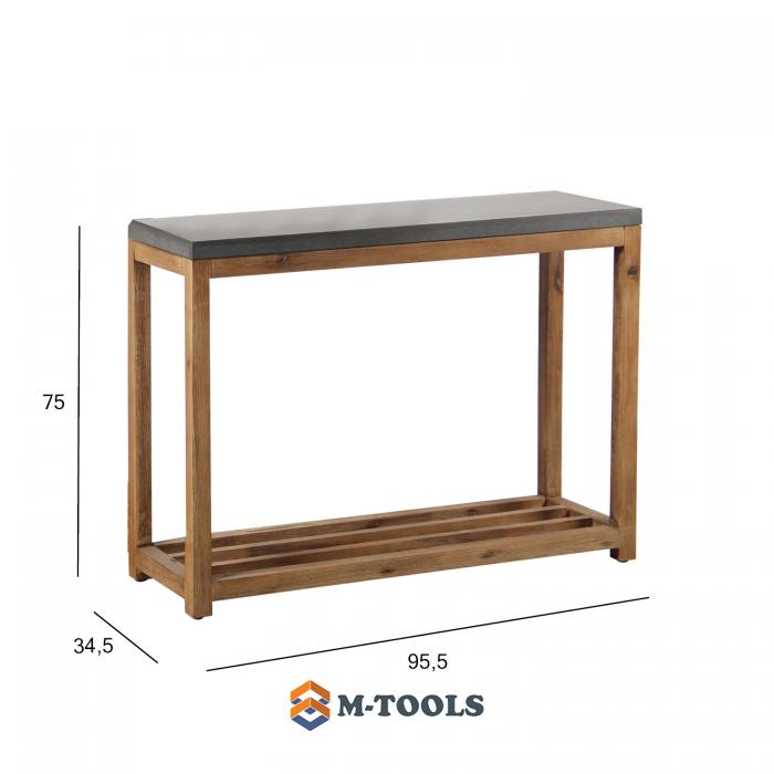 Shelf SANDSTONE 95,5x34,5xH75cm, gray fiber cement, wooden frame. The upper shelf is made of fiber cement, the lower shelf and frame are made of acacia wood. Fiber cement is a material obtained by adding different fibers to the concrete mass. The material is light and weather resistant. SANDSTONE series is suitable for both indoor and outdoor use. STORAGE: at the end of the summer season, we recommend storing the shelf indoors. Use a dry and well-ventilated room for storage. |